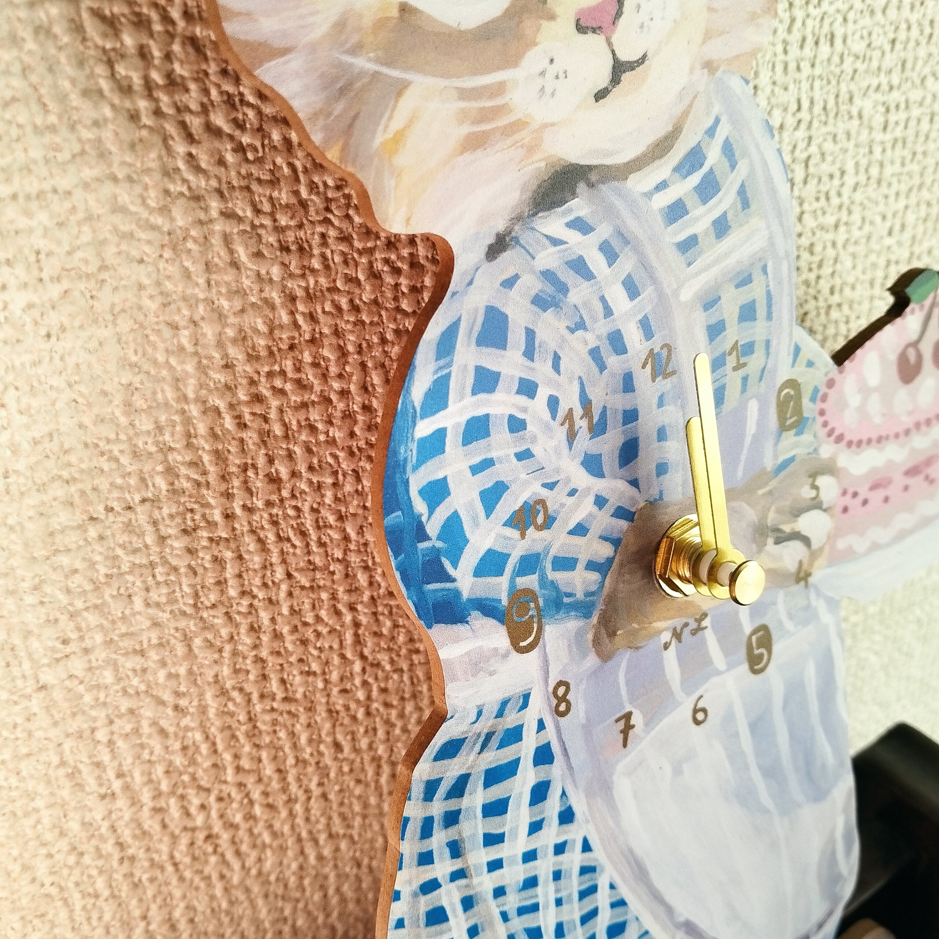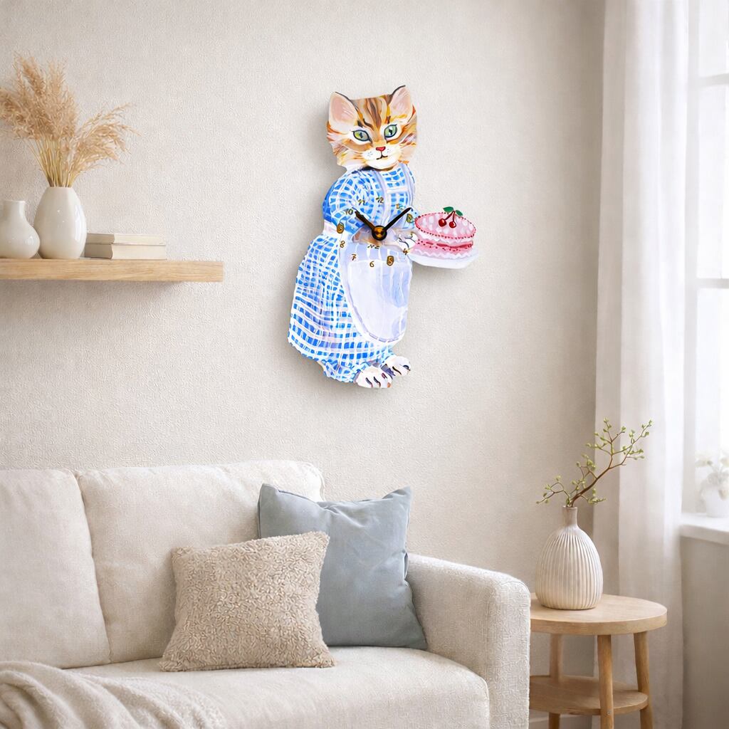 さくらんぼのケーキをもってアンニュイな表情の猫。白い壁にかけるとお部屋がとっても明るくなります
